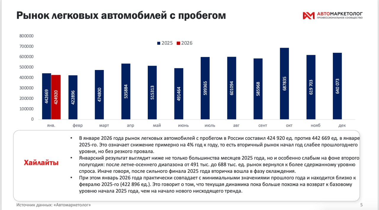 Особенно показательно, что текущий результат находится лишь немного выше уровней февраля и марта 2025 года (78 053 и 79 963 ед. соответственно), тогда как во втором полугодии рынок жил совсем в другой амплитуде: с июля по декабрь месячные продажи новых легковых автомобилей держались в диапазоне от 120 778 до 165 861 единицы. | | | | | | | | | Вторичка сбавила ход: как рынок автомобилей с пробегом вошел в 2026 год | | По данным «Автомаркетолога», январь 2026 года на вторичном рынке России начался с умеренного охлаждения, а не с обвала. Если смотреть на весь рынок подержанных транспортных средств, в январе было реализовано 467 771 единиц против 494 769 годом ранее, то есть на 5% меньше. Это важно понимать в связке с итогами всего 2025 года: тогда рынок новых ТС по стране заметно просел, а вторичный, напротив, в целом удержал положительную динамику. Поэтому нынешнее снижение в начале 2026-го выглядит скорее как коррекция после сильного финала прошлого года, чем как резкий разворот рынка вниз.