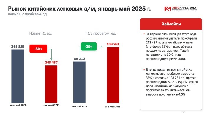 | | 🏆Учимся у победителей! | Недавно «Автомаркетолог» наградил победителей спецпремии «Автомаркетолог года», где были выбраны лучшие специалисты в своём деле, добившиеся наибольшего успеха за этот год. Теперь мы знаем, кто они. А во вторник, 24 июня, в 12:00 они расскажут, как этого достигли. Да, всё верно, топовые автомаркетологи, обладатели престижной награды, проведут вас через свои кейсы, поделятся лайфхаками и секретами, которые помогут преуспеть на конкурентном рынке. Во время короткой и насыщенной трансляции мы услышим представителей FRESH, «Диалог Авто», «Авто Брокер Мурманск», «МореАвто» и «АвтоКласс Эксперт». Регистрация займёт не больше минуты и полностью бесплатна. За последнее, кстати, спасибо поддержке компании Jump.Finance. | | | | | | | | Интересные материалы недели | | | | | Странное поведение акций Теслы | Tesla находится в сложной ситуации, характеризующейся снижением глобальных продаж и усилением конкуренции, однако за последние семь недель стоимость ее акций выросла более чем на 100 долларов. Как так? | | | | | | Китайские бренды теряют на рынке новых авто, но выигрывают на вторичке | | В мае 2025 года на российском рынке зафиксирован разнонаправленный тренд в сегменте китайских легковых автомобилей. Продажи новых автомобилей из Китая, по данным «Автомаркетолога», сократились на 30% год к году — с 72 406 до 50 726 единиц. Это снижение стало одним из самых резких в году, однако такие машины по-прежнему составляют основную долю рынка: в мае на них пришлось более 55% всех новых авто. За период с января по май продажи новых китайских легковушек снизились на те же 30% и составили 243 437 единиц против 345 815 годом ранее. | | | | | | | | | | Адаптация к турбулентному рынку — не выживание, а управляемая эволюция