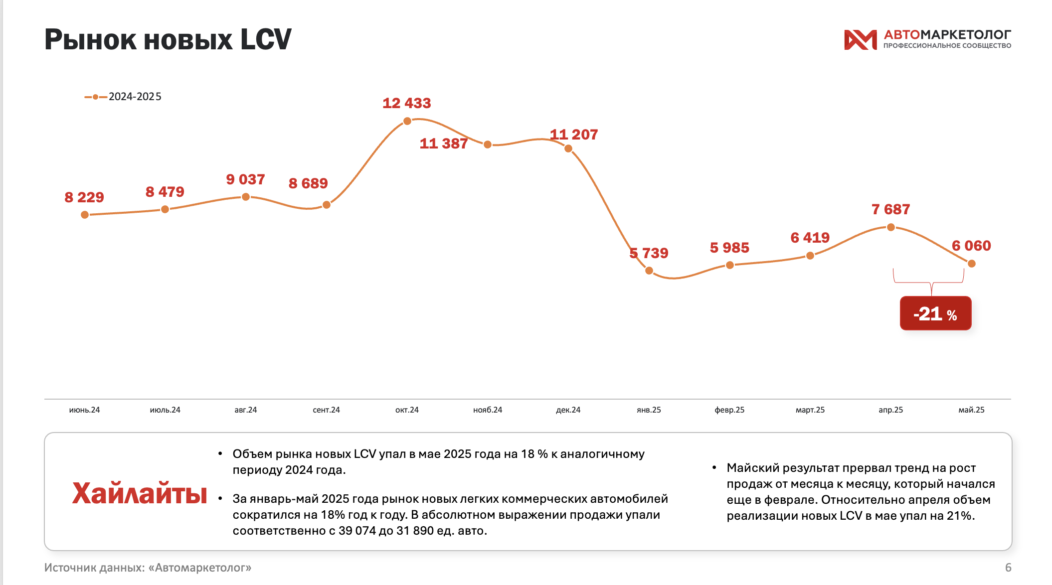 В мае 2025 года российский рынок новых легких коммерческих автомобилей (LCV) показал заметное снижение — продажи сократились, по данным «Автомаркетолога», на 18% по сравнению с маем прошлого года и на 21% по сравнению с апрелем. Тем самым был прерван ростовой тренд, начавшийся в феврале: после январского провала рынок постепенно восстанавливался, но май вернул его к нисходящей траектории.