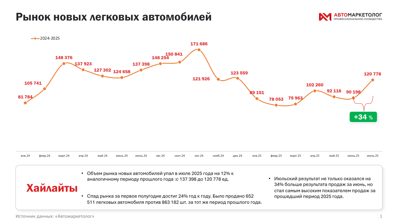 Тем не менее, по итогам семи месяцев рынок по-прежнему в минусе: реализовано 652,5 тыс. автомобилей против 863,2 тыс. годом ранее, что соответствует падению на 24%. Таким образом, даже несмотря на июльскую оттепель, говорить о восстановлении пока рано — тренд остается отрицательным.