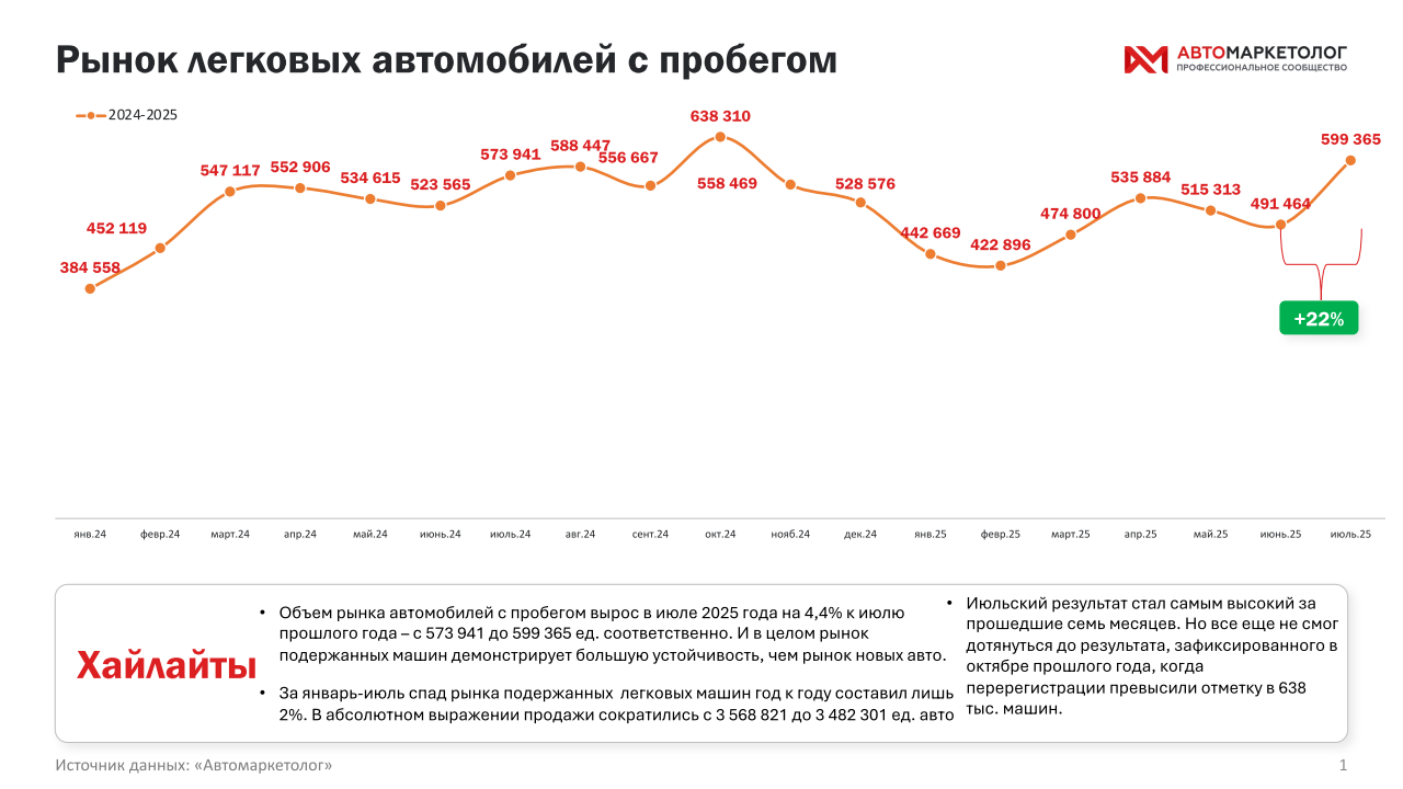 | В июле 2025 года российский рынок легковых автомобилей с пробегом показал уверенный рост, достигнув 599,4 тыс. перепродаж, что на 4,4% выше результата июля прошлого года (573,9 тыс.) и сразу на 22% выше показателя июня. Это лучший месячный результат за последние семь месяцев, хотя он и не дотянул до рекорда октября 2024 года (638,3 тыс. машин). В целом за январь–июль продажи составили 3,48 млн автомобилей, что лишь на 2% меньше, чем годом ранее, что подтверждает более высокую устойчивость сегмента подержанных машин по сравнению с рынком новых авто.