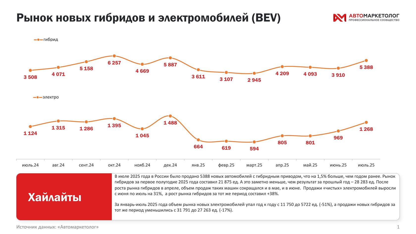 |    | |   |   |   | Электромобили и гибриды: рынок ищет новые точки опоры |   | Рынок «зеленых» технологий в России входит в фазу нестабильности. В июле 2025 года продажи гибридов, согласно данным «Автомаркетолога», составили 5 388 автомобилей, что лишь на 1,5% выше результата прошлого года. На первый взгляд это сигнал устойчивости, но если смотреть на весь период январь–июль, картина выглядит тревожнее: рынок просел на 17% до 27 263 машин против 31 791 годом ранее. Электромобили остаются еще более уязвимым сегментом — за семь месяцев их продажи упали вдвое, с 11 750 до 5 722 единиц (–51%). При этом в июле рынок BEV отыграл часть потерь — рост составил 31% к июню (с 969 до 1 268 ед.), но это скорее разовое восстановление, чем новый тренд. Главной проблемой остается высокая волатильность: всплески спроса в одном месяце сменяются резким спадом в другом. Так, после пика октября–декабря 2024 года рынок откатился в январе–марте 2025-го более чем вдвое. Такая динамика подчеркивает зависимость от акций, субсидий и «разовых» поставок. Для дилеров и производителей это означает необходимость гибких стратегий, рассчитанных не на плавный рост, а на работу с постоянно меняющимся спросом.Всю статью читайте на сайте. |   |  |   |  |  |