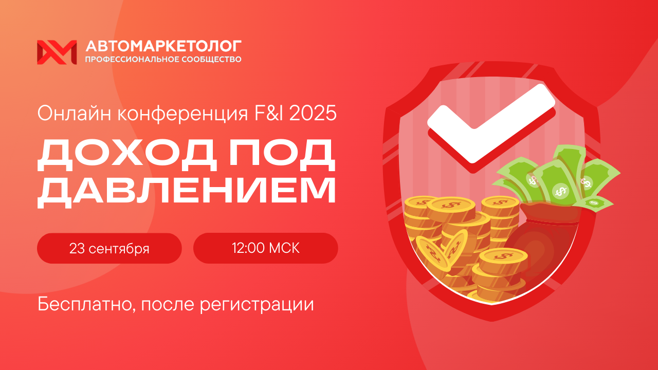 |   | |   |   |   | Коллеги, скоро пройдёт новая конференция «Автомаркетолога» |   | Поговорим, как монетизировать клиента в эпоху высокой ставки, отказов по кредитам и нового покупателя. Узнайте больше на сайте и зарегистрируйтесь (это, как всегда, бесплатно, и нужно, чтобы мы напомнили вам про мероприятие и прислали ссылку). |   |  |   |  |  |