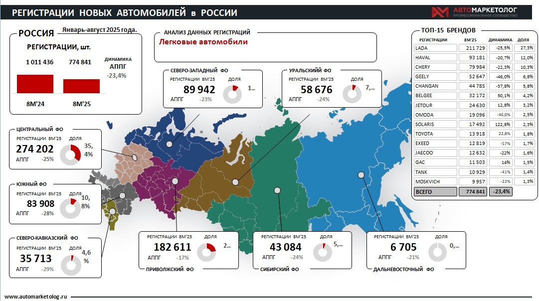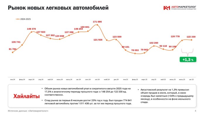 |    | |   |   |  |    |   |   | Август поддержал отскок, но год остается «красным» |   | По данным «Автомаркетолога», рынок новых легковых автомобилей в августе 2025 года составил 122 330 штук. Это на 17,5% меньше, чем год назад (148 254), но на 1,3% выше июля, то есть умеренное восстановление продолжается. С начала года продано 774 841 авто, что на 23% ниже результата января–августа 2024-го. После зимне-весеннего провала (январь–февраль были минимальными) второй квартал стабилизировал темп, а лето вернуло объемы к отметкам свыше 120 тысяч, хотя до прошлогодней базы далеко. |  |  |