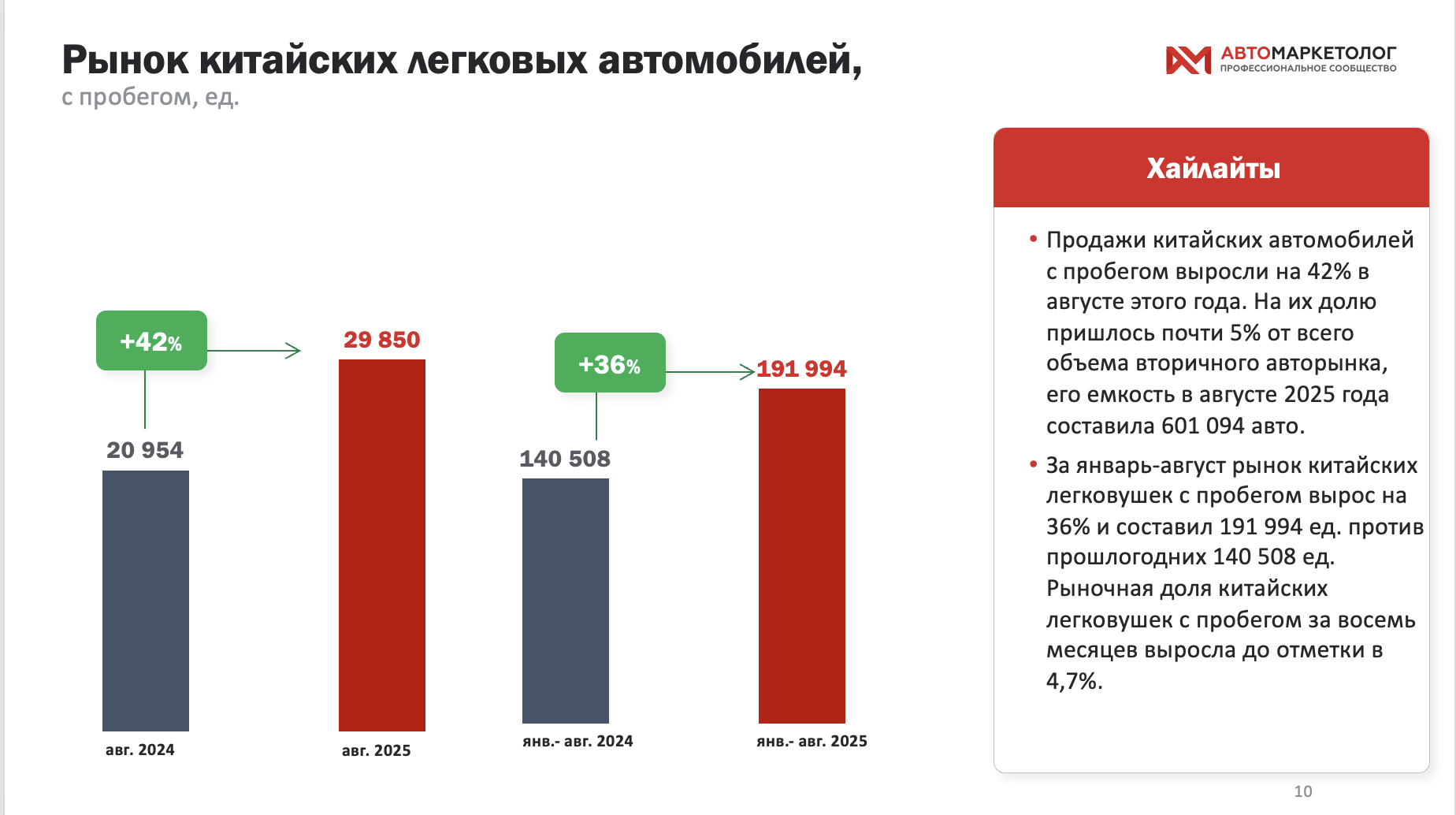 | Представляем вашему вниманию дайджест интересных материалов, которые вы могли пропустить на нашем сайте за последнюю неделю. Нечасто заходите на сайт? Вот что могло пройти мимо вас! | | | | | Посмотрите небольшое видео с обзором Аналитической платформы «Автомаркетолога», сервисом, где можно быстро получить актуальные данные по автомобильному рынку | Простой интерфейс, где быстро можно посмотреть всё, что нужно, — от регистраций новых авто до структуры автопарка и вторичного рынка, с возможностью срезов по регионам, брендам, моделям, клиентским сегментам и другим параметрам. Все данные, разумеется, из официальных источников. Смотрите там, где удобно [ YouTube] | [ RuTube] | [ VK Видео] | | | | | | | | Интересные материалы недели | | | | | Выручка авторынка: 2,38 трлн рублей за январь-август — центр тяжести смещается в Китай | | По данным «Автомаркетолога», вторичный рынок китайских легковых автомобилей продолжил расширяться и в августе 2025 года вырос до 29 850 сделок против 20 954 годом ранее (+42% год к году). Это почти 5% от общего объема вторичного рынка (емкость августа — 601 094 автомобилей) и новая высокая «планка» для сегмента. В накопленном выражении за январь–август 2025 года продано 191 994 подержанных «китайцев» против 140 508 ед. в 2024-м (+36% год к году), а их доля в общероссийских перепродажах выросла до 4,7%.