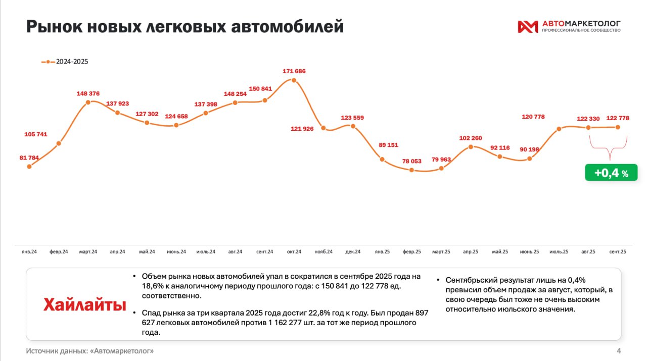 | Российский рынок новых автомобилей в сентябре: стабилизация после годового спада | По данным «Автомаркетолога», динамика продаж новых легковых автомобилей с января 2024 по сентябрь 2025 года демонстрирует волнообразное восстановление, а затем стабилизацию на новом уровне. В сентябре 2025 года продано 122 778 ед., что на 18,6% меньше, чем в сентябре 2024 года (150 841 ед.), но на 0,4% больше результата августа 2025 года (122 330 ед.). За три квартала 2025 года накопительно реализовано 897 627 авто, что на 22,8% ниже уровня января–сентября 2024 года (1 162 277 ед.). | | | | | | Рынок б/у легковых: сентябрь остыл к августу, но годовое отставание умеренное | По данным «Автомаркетолога», российский рынок легковых автомобилей с пробегом в сентябре 2025 года составил 585 968 ед. Это на 2,5% меньше, чем в августе (601 094 ед.), и на 5% выше результата сентября 2024 года (556 667 ед.). Внутри квартала чувствуется плавное охлаждение: от июльско-августовского локального максимума 599 365 и 601 094 ед. соответственно к сентябрю рынок просел на 2,2%, но без резких движений — фактически мы видим возвращение к «рабочему» коридору 0,58–0,60 млн авто в месяц, удерживающему вторичный спрос с начала лета. | | | | | Заинтересовались статистикой? Хотите заказать отчёт? Пишите! | | | | Вы получили это письмо, потому что подписаны на наши рассылки. Если вы хотите прекратить получать наши рассылки, вы можете отписаться. Письмо отображается некорректно, воспользуйтесь его веб-версией. | © ООО «Автомаркетолог» — 2025. Все права защищены. 125430, г. Москва, Митинский 1-й пер., д.25 | | | | | |