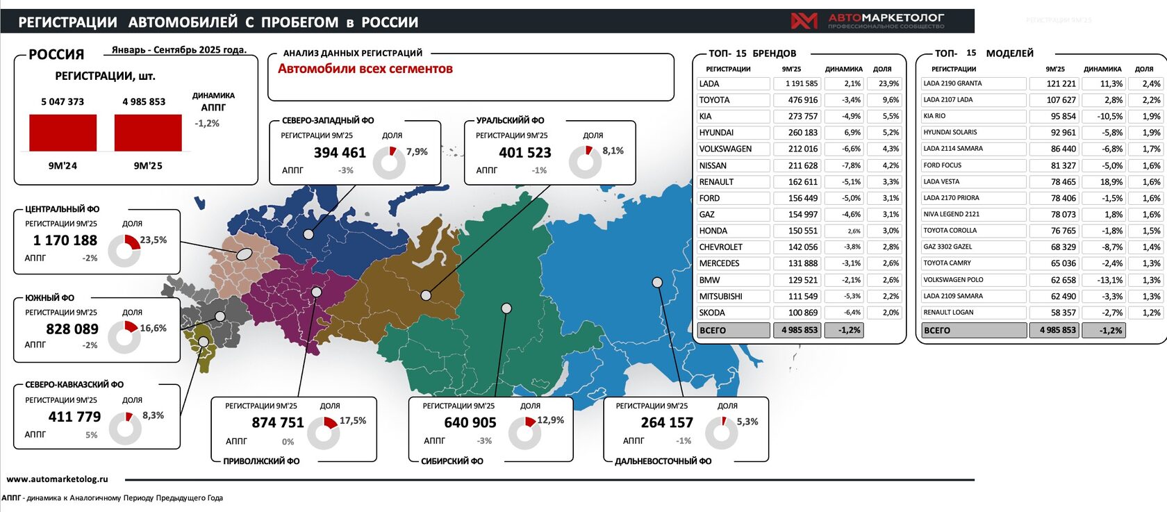 В программе — кейсы лидеров рынка и чек-листы действий на 90 дней. Офлайн — для плотного нетворкинга топ-менеджеров; онлайн-трансляция — на YouTube, VK и RuTube. Присоединяйтесь, чтобы увести прибыль из «зоны риска» в «зону управления». Зарегистрируйтесь по ссылке и добавьте событие в календарь. | | | | | Интересные материалы недели | | | | Персонализация маркетинговых кампаний в автобизнесе | Индивидуальный подход к клиенту — уже не роскошный максимум сервиса, а необходимый минимум маркетинга. Вместе с руководителем агентства цифрового маркетинга «Аксиома Веб» разбираемся, как внедрять и эффективно использовать персонализацию для продвижения автобизнеса. | | | АВТОВАЗ приступил к сертификации LADA Azimut | На АВТОВАЗе начался этап подготовки LADA Azimut к государственным испытаниям для получения Одобрения типа транспортного средства и допуска к продажам в России. За ближайшие полтора месяца на главном конвейере соберут 16 предсерийных машин; первые пять уже выпущены и направляются на тесты. | | | | | Авторынок по федеральным округам: «первичка» сдала позиции, «вторичка» удержалась | По данным «Автомаркетолога», за январь–сентябрь 2025 года рынок новых легковых автомобилей сократился на 22,8% год к году — до 897 619 ед., тогда как рынок автомобилей с пробегом снизился лишь на 1,2% — до 4 985 853 ед. Структура спроса по федеральным округам показывает, что провалы в «первичке» носят повсеместный характер, тогда как вторичный авторынок остается более стабильным и тянется регионом-локомотивами.
