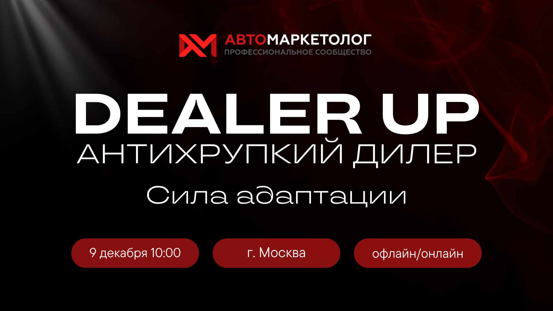 | 9 декабря в Москве состоится DealerUp 2025 — «Антихрупкий дилер». Это конференция команды "Автомаркетолога" пройдет в режиме офлайн + онлайн.